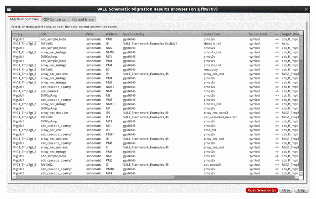 - The second part completes each skeleton target schematic with instances from the target technology, transforming and rewiring these instances according to the data gathered in the first part. For more information, refer to Migration Part 2: Creating Target Schematic.