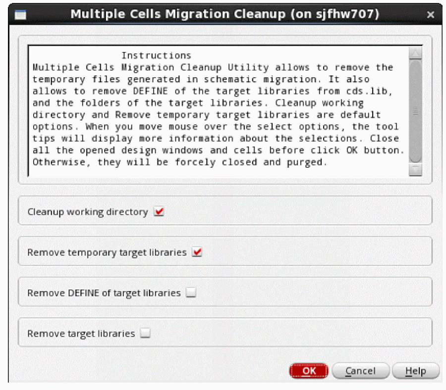 The software allows you to clean the working folder, temporary target libraries, or all the libraries. Note that the cleaning utility is applied to the same process with the similar settings. For example, if migration with a selected cell list has been setup, and has run part 1, part 2, and part 3, then you can run the utility to clean up the created files. If the settings have been changed, the files created in previous processes will not be removed.