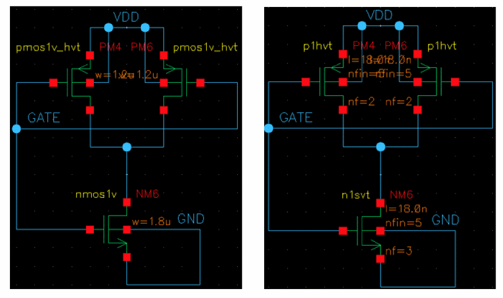This section explains how to create a technology map. As an example, Cadence provides a Generic Process Development Kits (GPDKs) on Cadence Online Support (COS), at http://support.cadence.com. Figure 1 shows a portion of a schematic from the 45nm GPDK (library gpdk045) on the left and the same portion of a schematic from the 10nm GPDK (library cds_ff_mpt) on the right. Both use parameterized cells (Pcells) from their respective PDKs.
