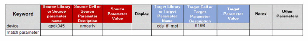 First, notice the n-type device name (in yellow, near the bottom-center), changes from nmos1v to n1svt. The spreadsheet syntax to accomplish this device map is shown below.