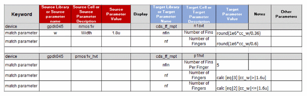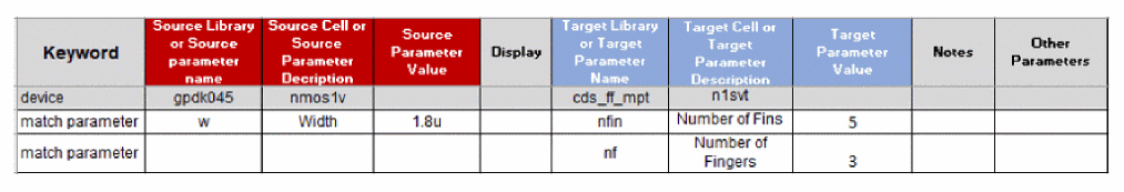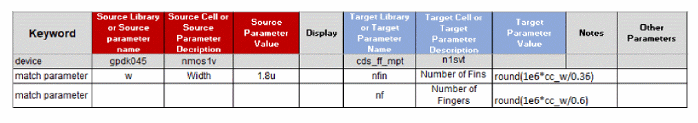 w = 1.8umchanges to target parametersnfin = 5, andnf = 3(ignoring thel = 18.0nas it does not relate to the source width). These parameters are Component Description Format (CDF) parameters of the PDK Pcells. The figure below shows the spreadsheet syntax to accomplish this CDF parameter mapping.