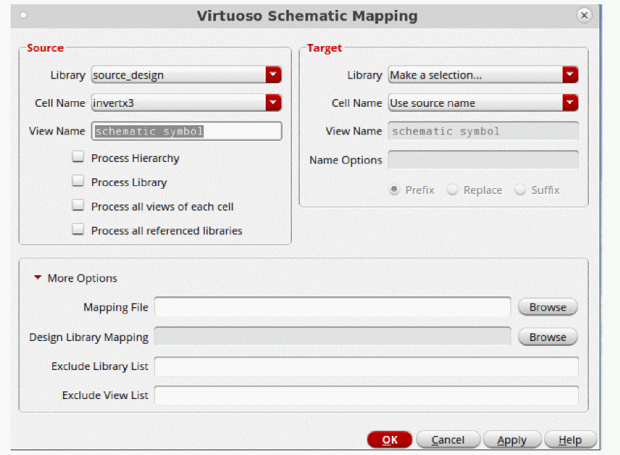 First, if the source schematic is a hierarchical schematic, then the Process Hierarchy check box under the Source group box will traverse the schematic hierarchy and migrate all the cells in the source library hierarchy, filtered by the options View Name, Process all views of each cell, Exclude View List, and Exclude Library List. Libraries other than the source library hierarchy (and not listed in the mapping file) will not be migrated by default. If there are outside design library references that should be migrated, select the Process all referenced libraries, and either enter the source and target library map as a space separated pair, and separate each pair by a comma; or use the corresponding Browse button to specify a comma separated values file. For example, the Design Library Mapping comma separate values file is shown below: