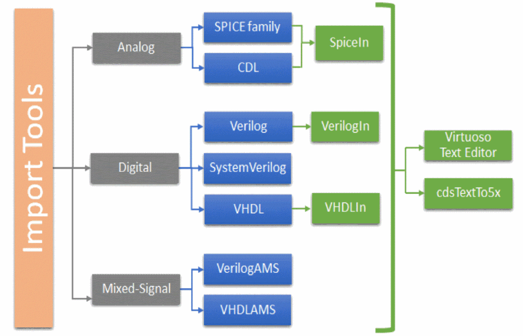 The cdstextTo5x binary lets you import analog, digital, and mixed-signal text files of designs written in various languages into the Virtuoso Studio Design Environment. It supports information written in SPICE, CDL, Verilog, SystemVerilog, Verilog AMS, VHDL, or VHDL AMS.