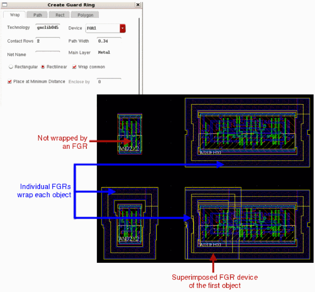 Description: The following issues have been observed when you create an FGR around a group of devices in Wrap mode with the Wrap common check box and Rectilinear radio button selected on the Create Guard Ring form: