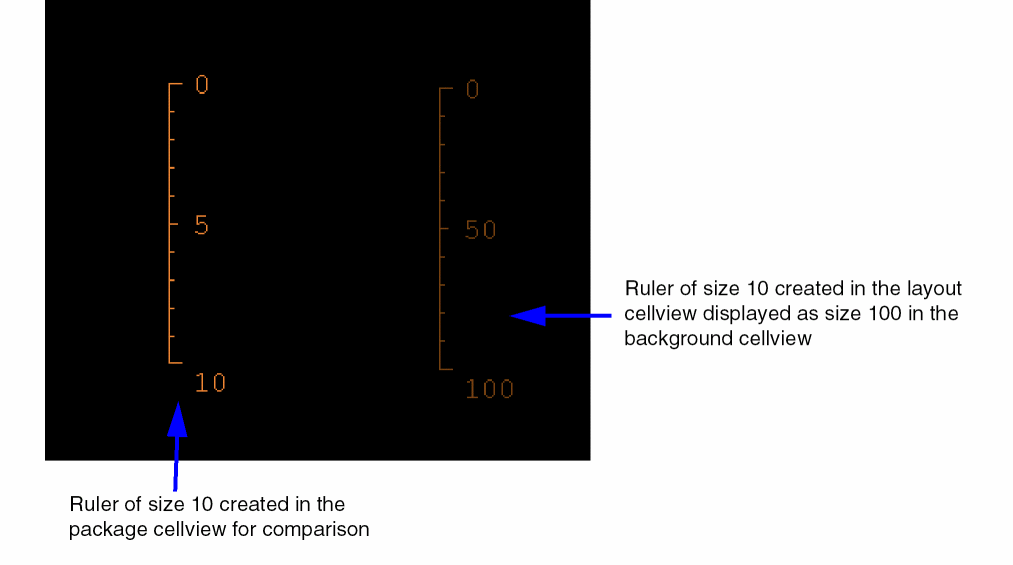 For example, when you create a ruler of size 10 in a layout cellview, it might get displayed as size 100 in the background layout cellview in the package layout.