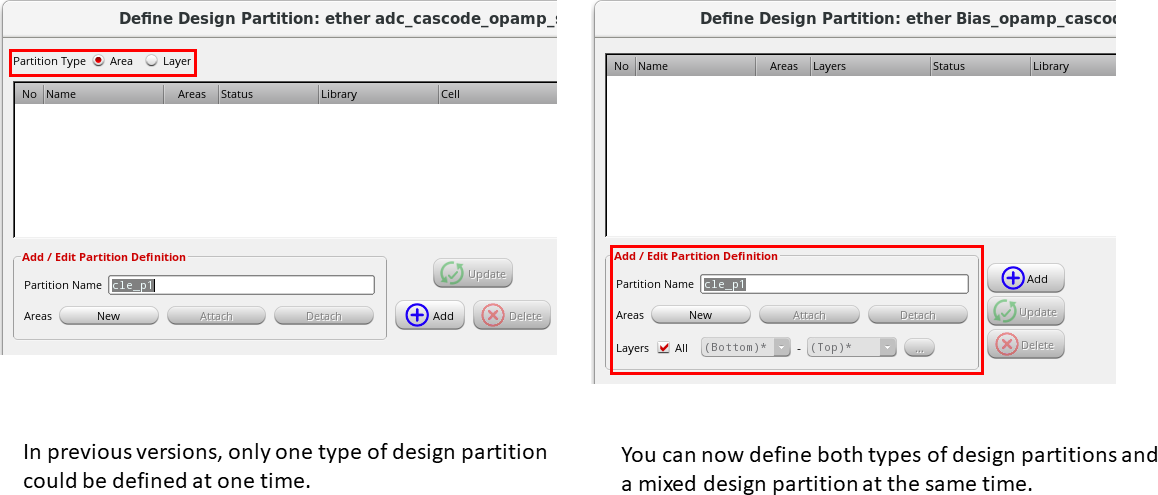 The Define Design Partition form has been updated to let you define both area-based and layer-based design partitions at the same time. You can also define a mixed design partition, where an area design partition is specified along with a range of layers for the design partition.