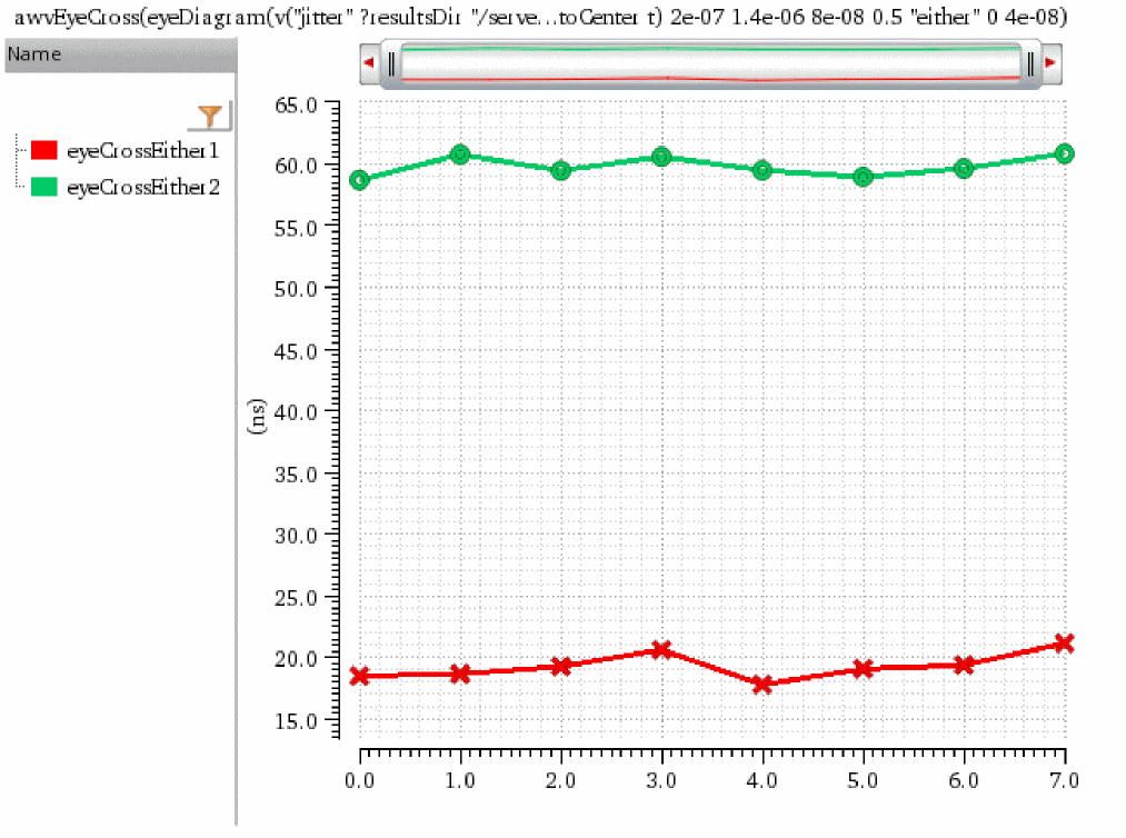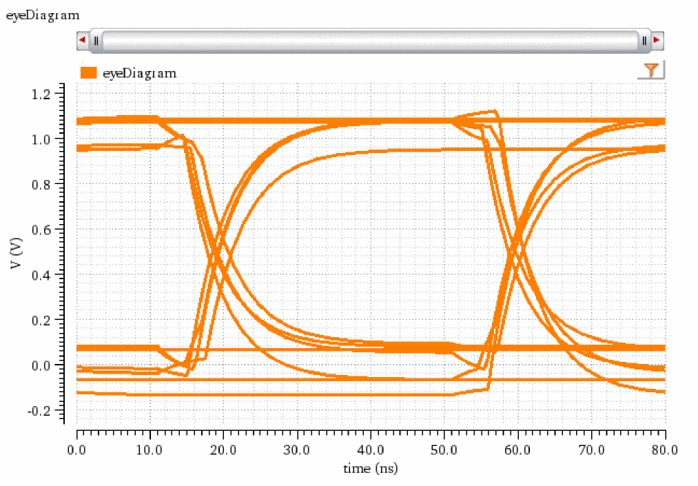 eye=eyeDiagram(jitter 200n 1.4u 2*40n ?autoCenter t)