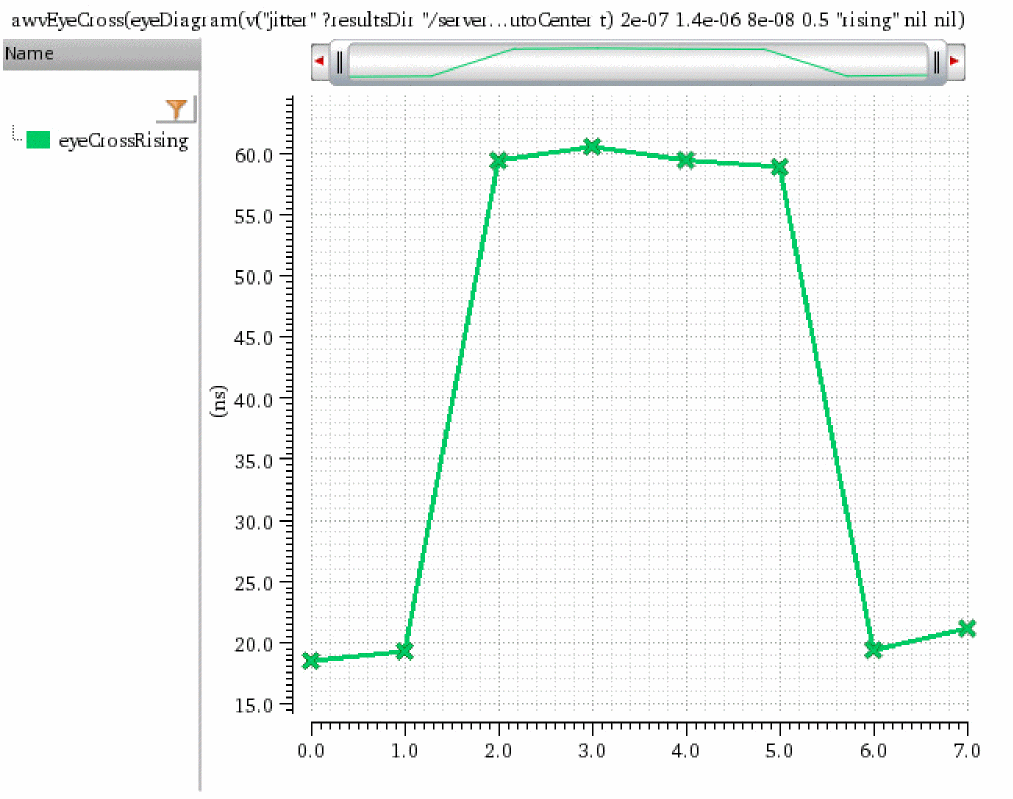 The following example creates a waveform object eyeCrossRising, which shows time when the rising edge of the eye diagram eye crosses the threshold value 0.5 plotted on y axis against the cross values plotted on x axis