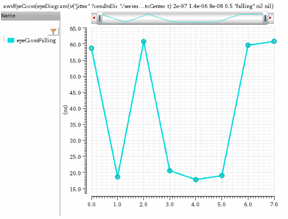 The following example creates a waveform object eyeCrossFalling, which shows time when the falling edge of the eye diagram eye crosses the threshold value 0.5 plotted on y axis against the cross values plotted on x axis.