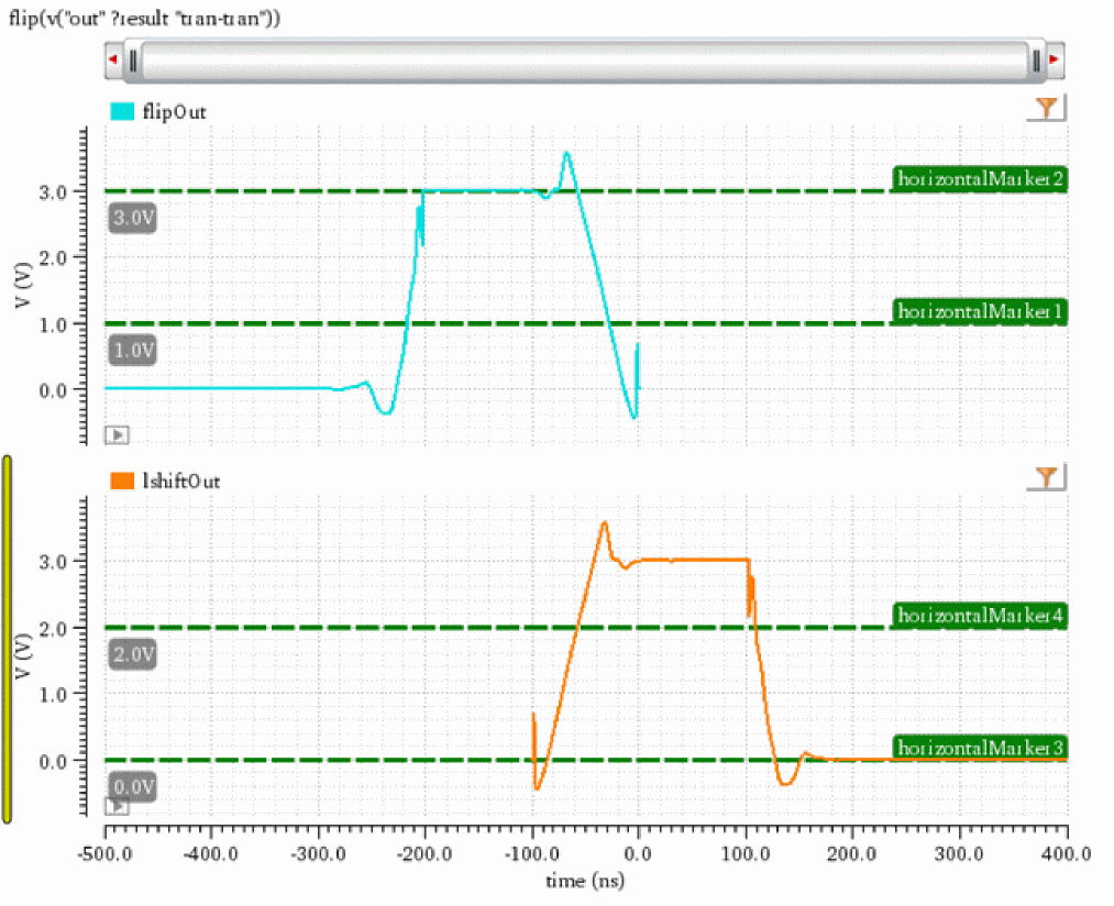 awvPlotExpression(window(3) "flip(v(\"out\" ?result \"tran-tran\")" nil ?expr list("flipOut") ?index list(1) ?color list("y12") ?lineType list("line") ?lineStyle list("solid") ?lineThickness list("medium") ?stripNumber list(1))