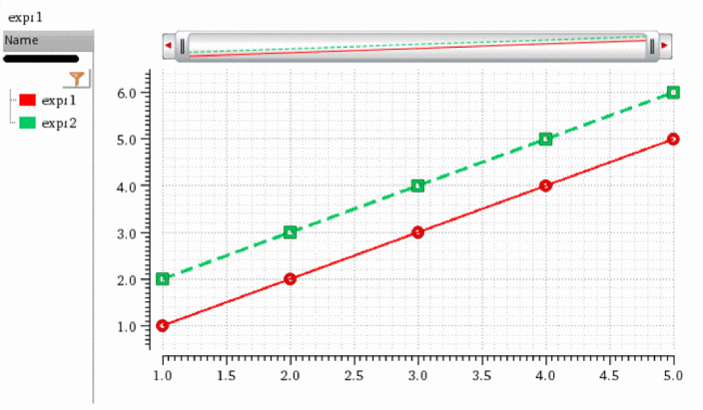The following example plots the y-axis values (1, 2, 3) and (2, 3, 4) against the x-axis values (1, 2, 3) as waveforms with names expr1 and expr2. The waveforms expr1 and expr2 are identified with the index numbers 1 and 2, respectively.