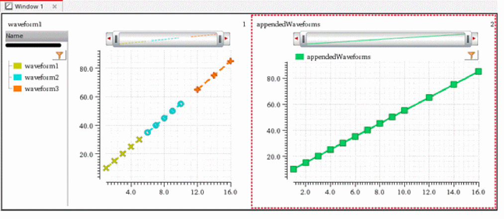 Appends a series of input waveforms in x-vector direction into a single output waveform.