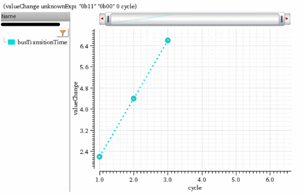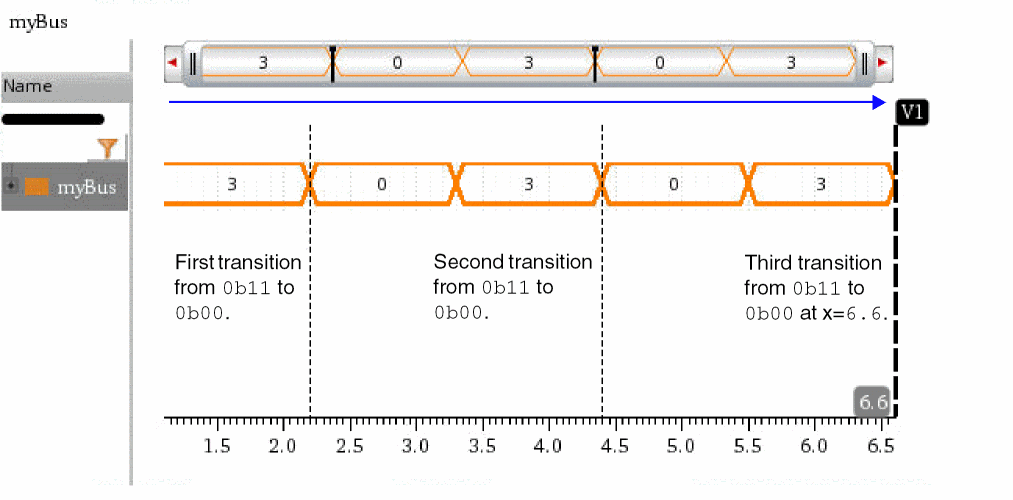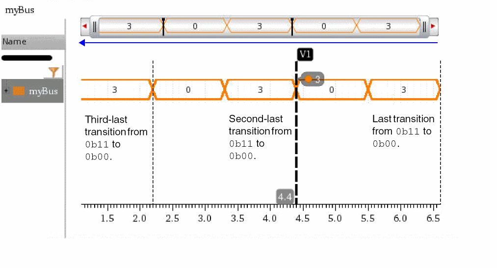 The following example returns the x-axis value at which the bus myBus transitions from binary value 0b11 (3decimal) to binary value 0b00 (0decimal) the second-last time.