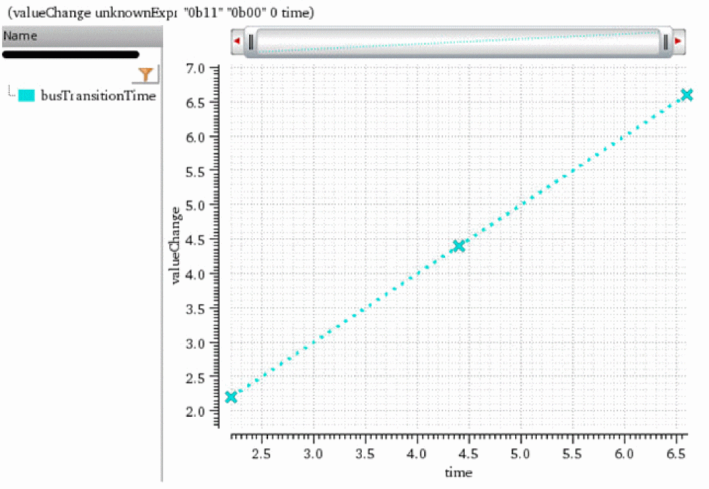 The following example returns the x-axis value at which the bus myBus transitions from binary value 0b11 (3decimal) to binary value 0b00 (0decimal) the third time.