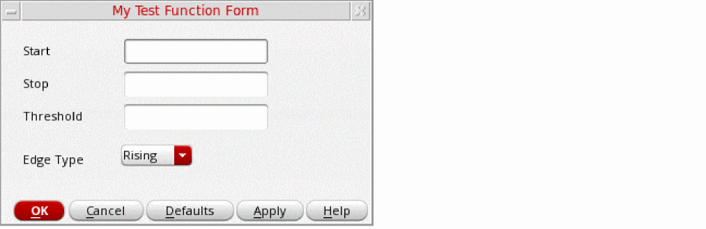 When you click myTestFunction from the SKILL User Defined Functions category in the Function Panel, the form that you created for the user-defined function using the function calCreateSpecialFunctionsForm opens.