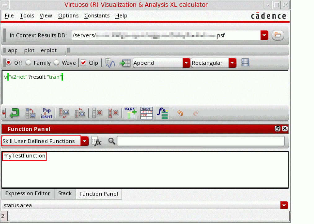 The next time you open the Calculator, the function myTestFunction, which you defined using the function calCreateSpecialFunction appear in the SKILL User Defined Functions category of the Function Panel, as shown in the following figure.
