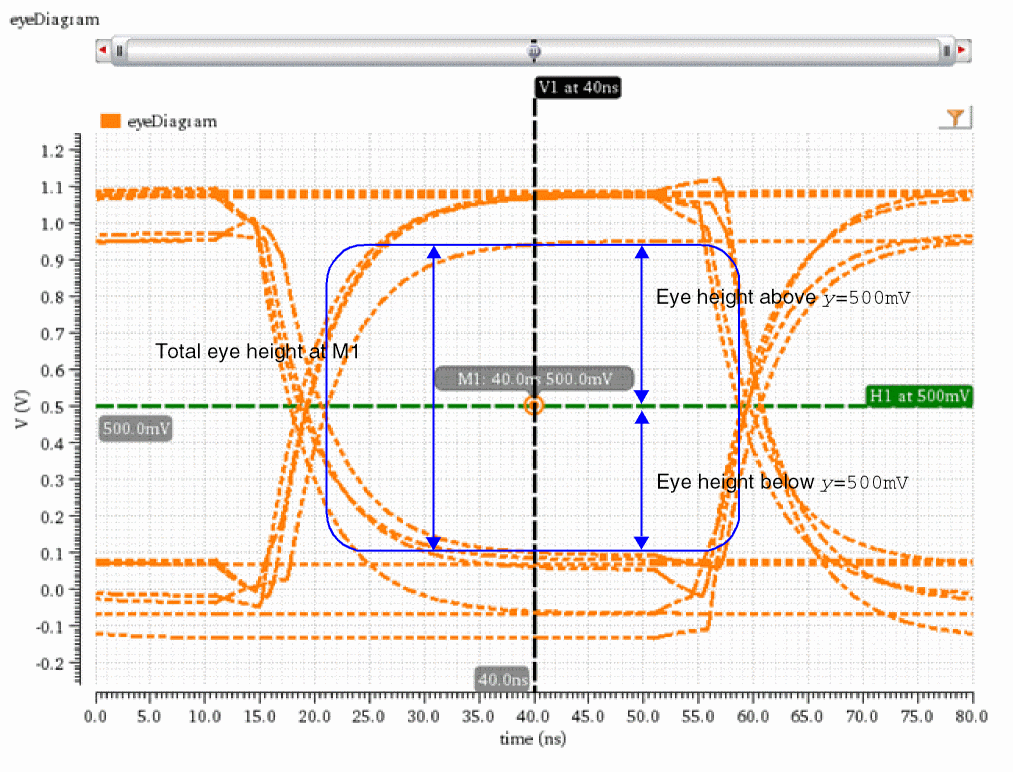 The following example calculates the eye height that is above y=0.5V (500mV) at point M1 (x=40ns, y=0.5).