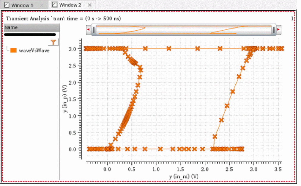 output=waveVsWave(?x v("in_m" ?result "tran-tran") ?y v("in_p" ?result "tran-tran") ?xName "y (in_m)" ?xUnits "V" ?yName "y (in_p)" ?yUnits "V")