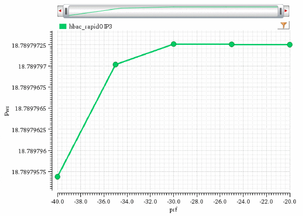 The following example creates a waveform object that represents the power plotted on y axis against the design variable prf, which is sweeping from -40 to -20.