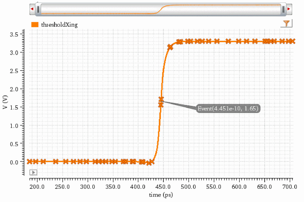 Note that the time is plotted on x axis and voltage is plotted on y axis. The marker on the waveform shows the time and threshold value.