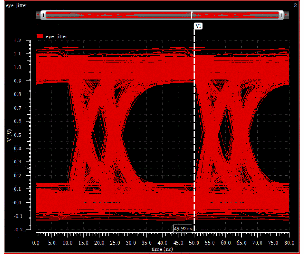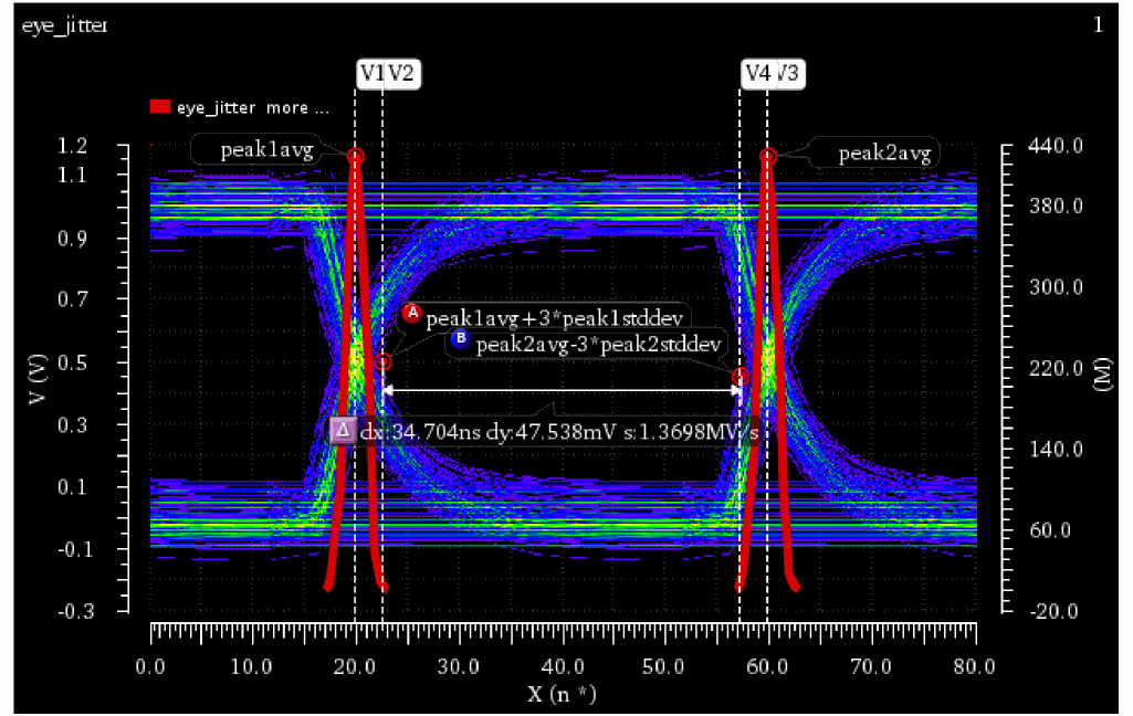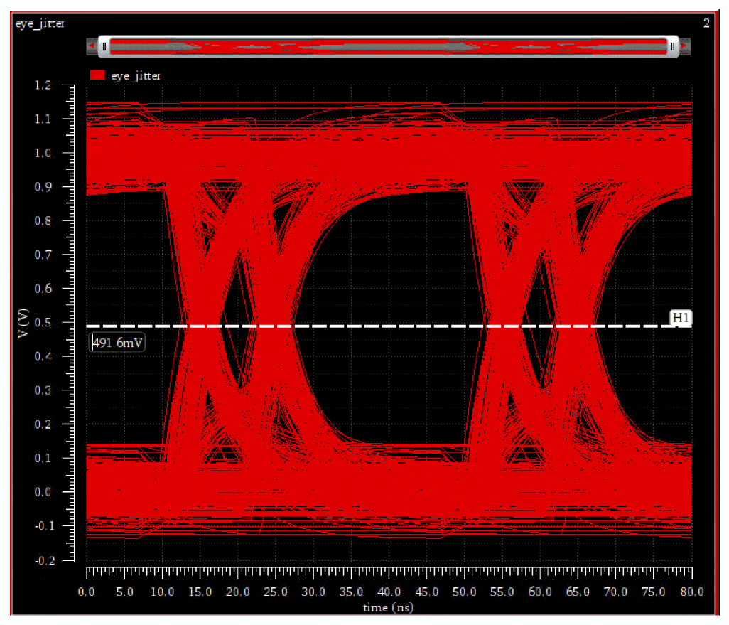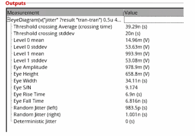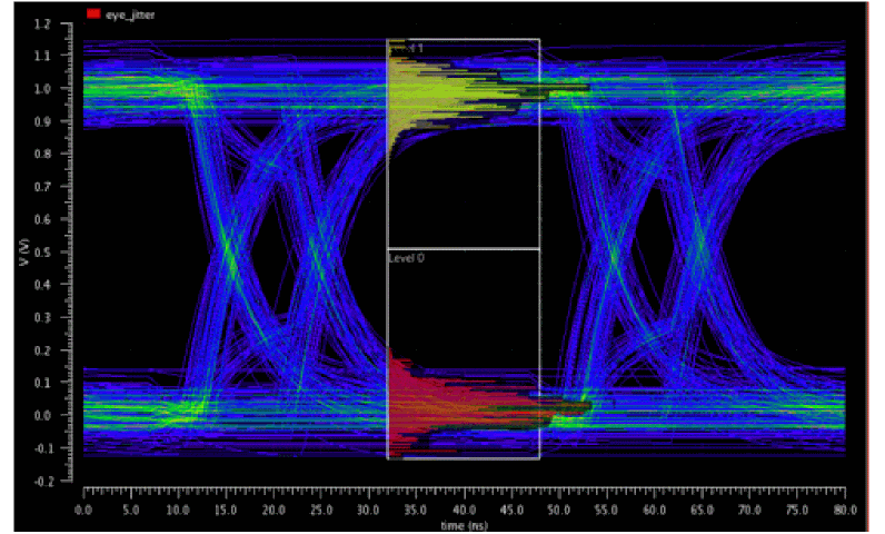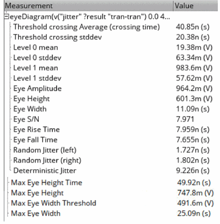 EyeAmp=eyeMeasurement(eyeDiagram(v("jitter" ?result "tran-tran") 5e-07 4e-05 8e-08 ?autoCenter t) 5e-07 4e-05 8e-08 0.5 nil t 40.0 0.0 t 60.0 50.0 t 40.0 50.0 t 60.0 100.0 100.0 "amplitude")