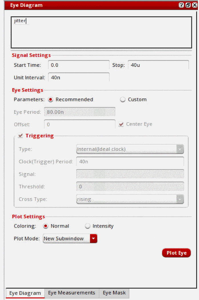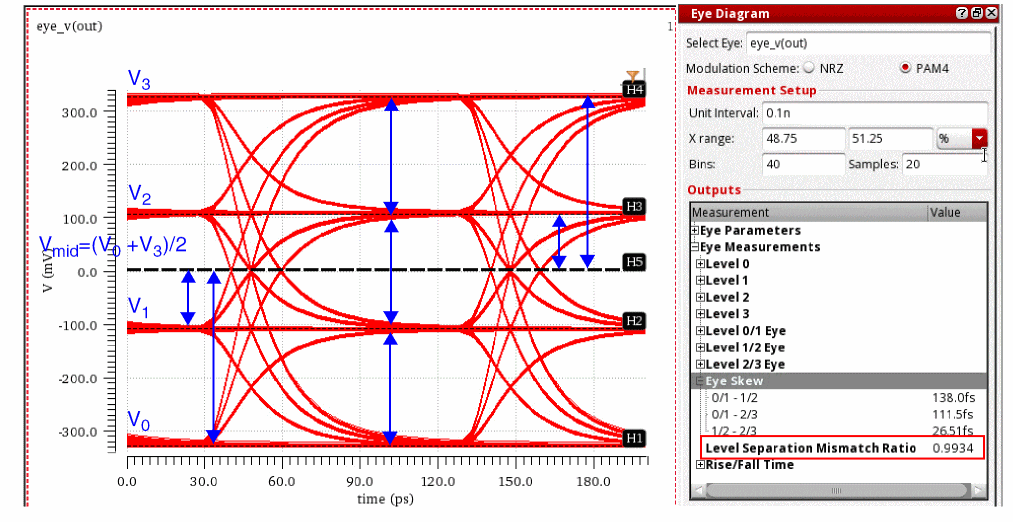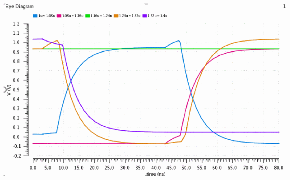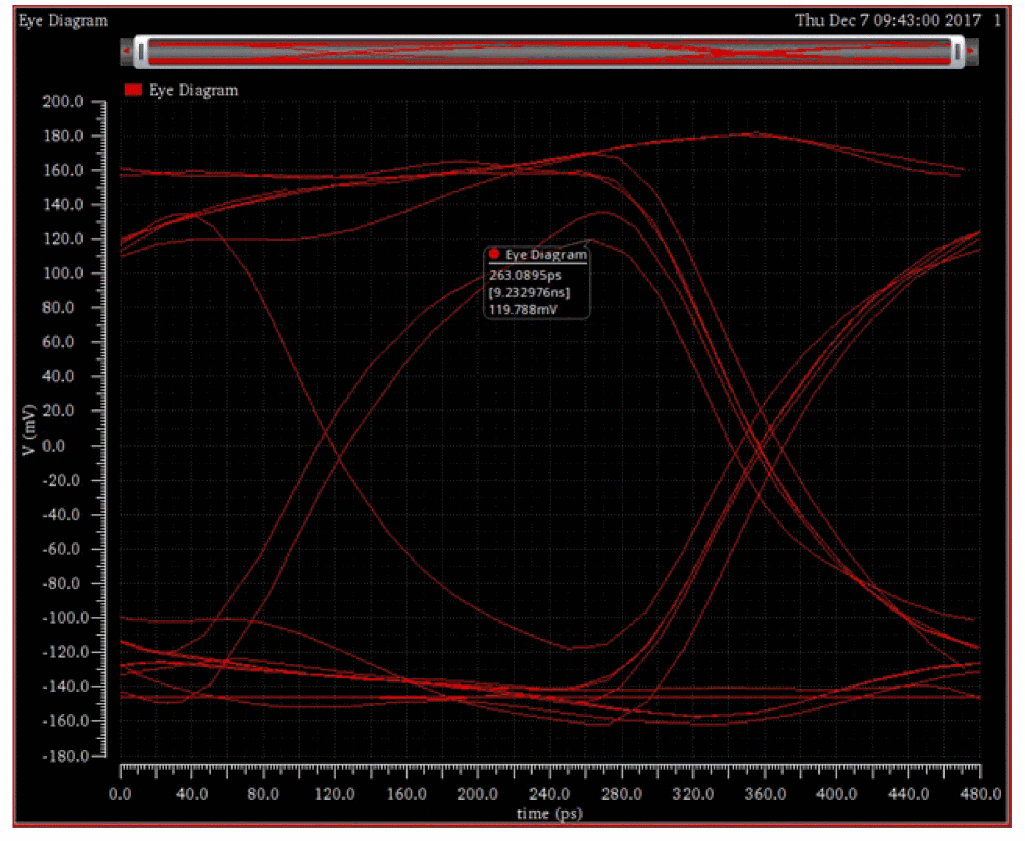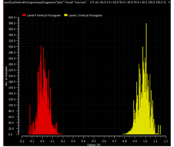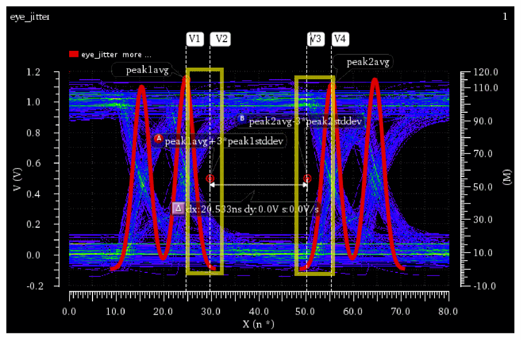 EyeAmp=eyeMeasurement(eyeDiagram(v("jitter" ?result "tran-tran") 5e-07 4e-05 8e-08 ?autoCenter t) 5e-07 4e-05 8e-08 0.5 nil t 40.0 0.0 t 60.0 50.0 t 40.0 50.0 t 60.0 100.0 100.0 "amplitude")