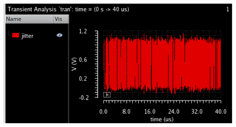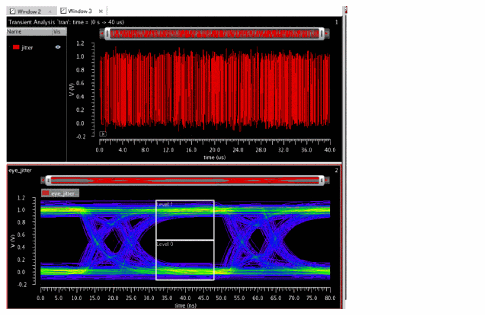 waveform=eyeDiagram(v("jitter" ?result "tran-tran") 0.5u 40.00u 80n ?autoCenter t) Level0Mean=eyeMeasurement(eyeDiagram(v("jitter" ?result "tran-tran") 5e-07 4e-05 8e-08 ?autoCenter t) 5e-07 4e-05 8e-08 0.5 nil t 40.0 0.0 t 60.0 50.0 t 40.0 50.0 t 60.0 100.0 100.0 "level0Mean")