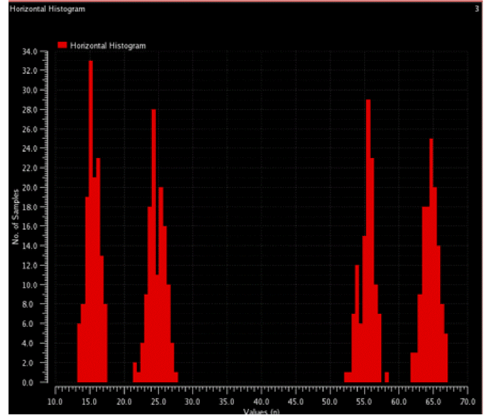 If deterministic jitter is present, each side's distribution is expected to have two peaks, and the deterministic jitter is the time difference of the peaks.