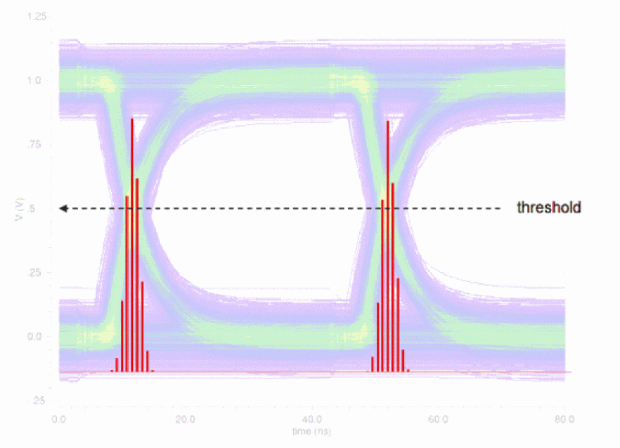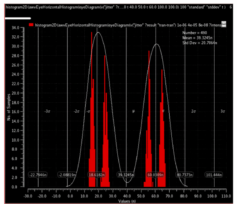 When no deterministic jitter is present, the distribution of the crossings forms a single normal distribution. The probability of a point being within 3*stddev of the mean is 99.7%. The eye width is calculated using the points shown in the markers below.