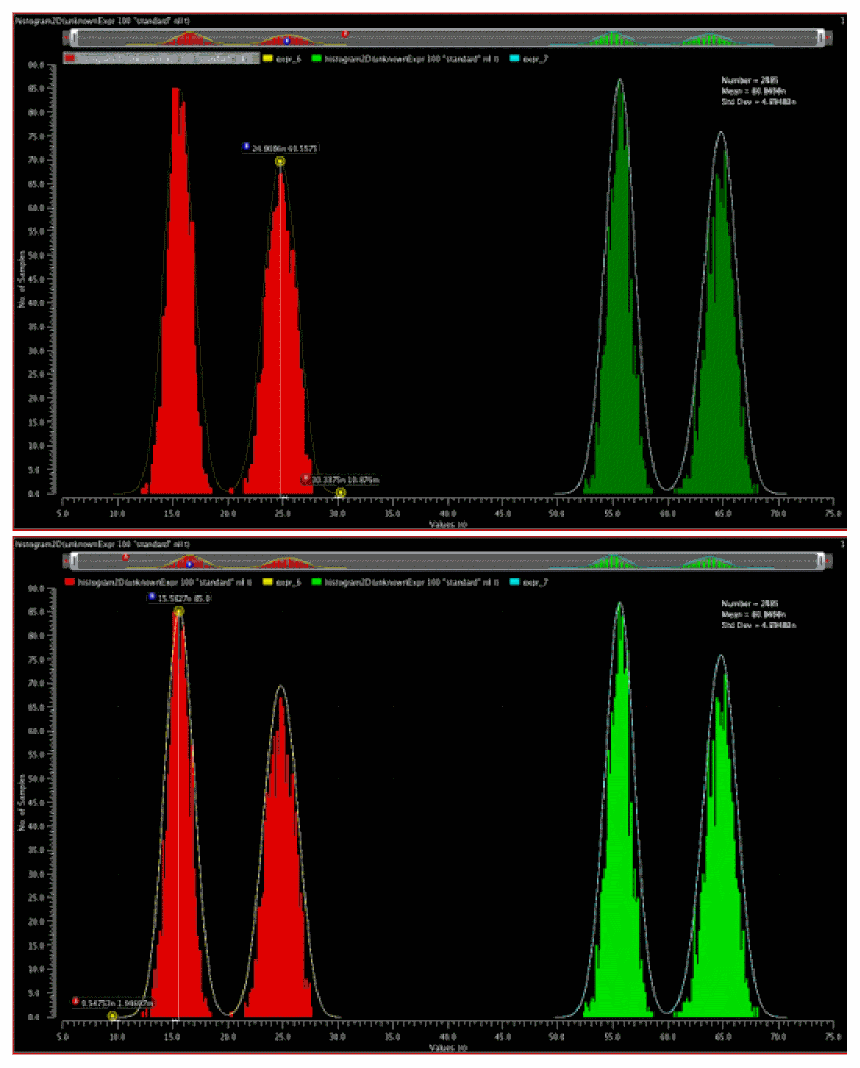 where u is the mean (B marker), x is the x-values from the A marker to B marker (tail of the distribution) and p is the corresponding height. This is repeated for the other tail (A to B in the figure below). The average stddev of the two tails is the output value of Random Jitter (left). The same is repeated for the green histogram to calculate Random Jitter (right). The output Deterministic Jitter is the average of the deterministic jitter of red and green.