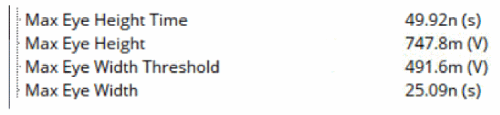 Max Eye Height calculates the largest vertical opening between 25% to 75% of the eye period above and below the threshold. The Eye Height Time is the time where the maximum eye height occurs. For example, the Maximum Eye Width is given as25.09nsat a threshold of491.6mVin the eye diagram below.