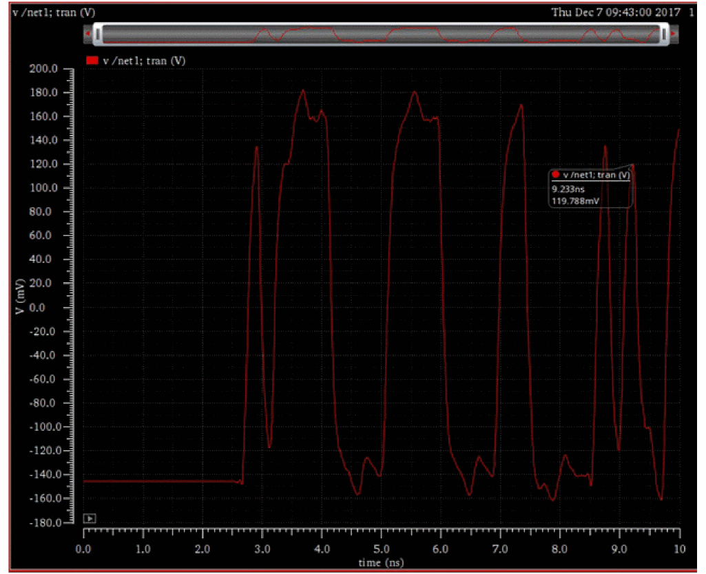 The time value for the original waveform before it gets folded into an eye diagram is also displayed in the marker label on the eye diagram. For example, consider the waveform for the v/net1 signal shown in the figure below. The label displays the time value on the x-axis as 9.233ns when the voltage on Y-axis is set to 119.788mV.
