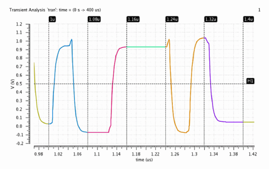 Consider creating an eye diagram using the following signal from time 1 us to 1.4 us. The signal has a unit interval (UI) of 40 ns.