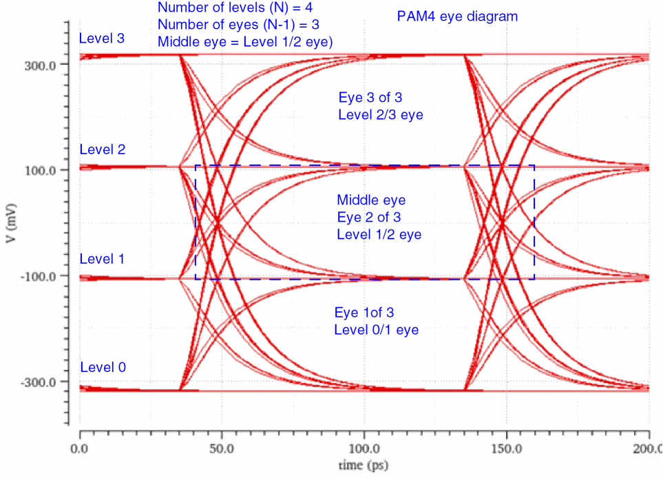 Depending on the modulation scheme, an eye diagram can have different voltage levels. For example, PAM4 has four voltage levels.