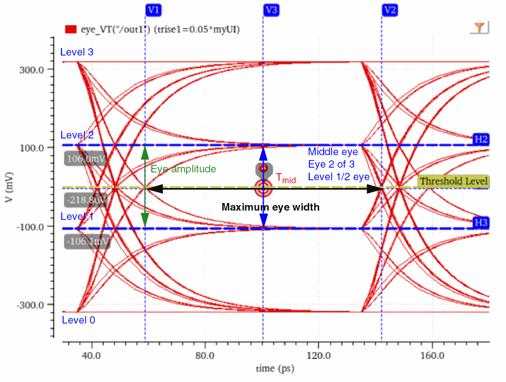 Eye measurements, such as eye height, eye width, and eye amplitude are based on Tmid, which is the midpoint of the maximum eye width of the middle eye.