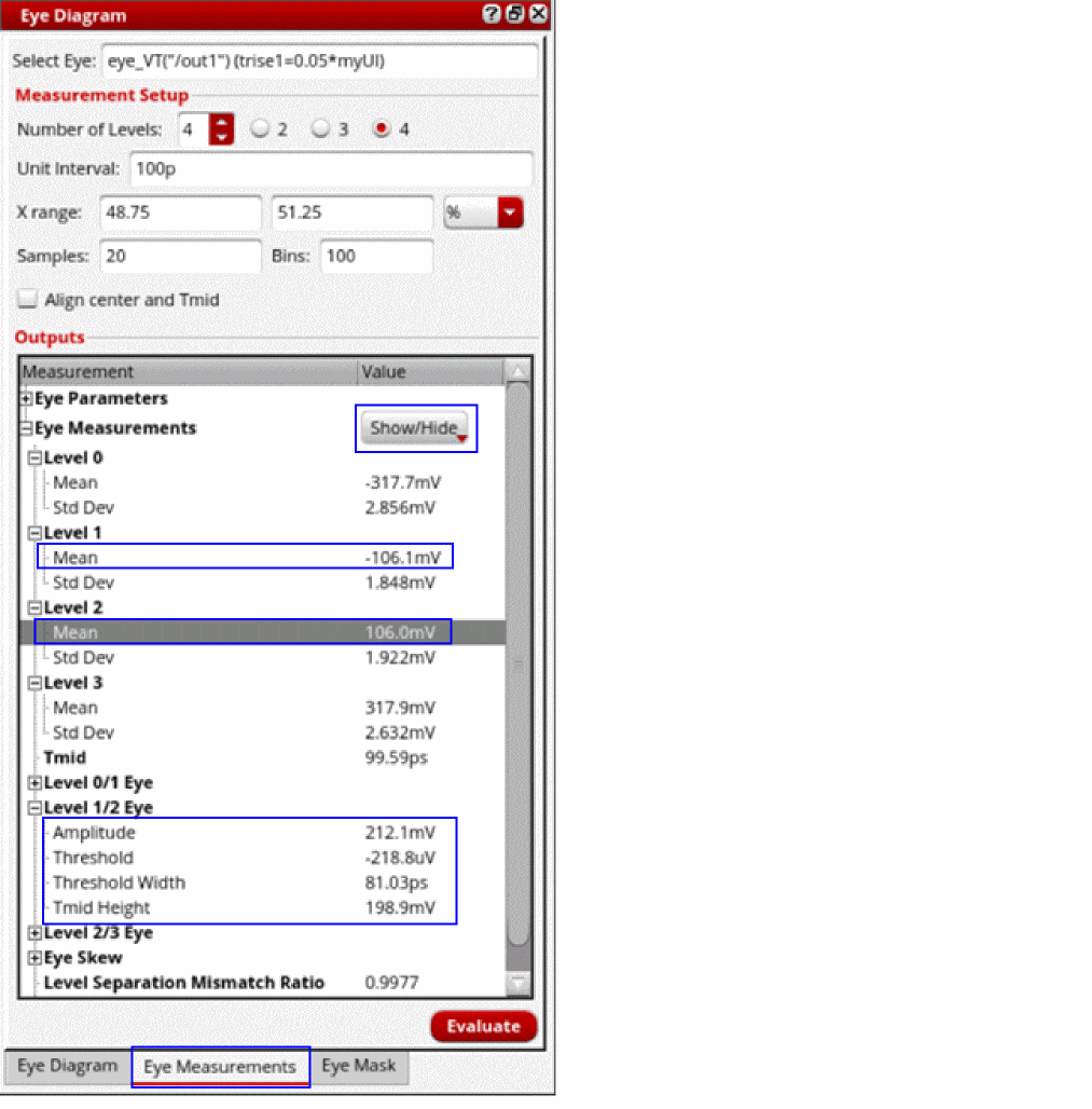 These calculations can be verified using the Eye Measurements tab of the Eye Diagram assistant.