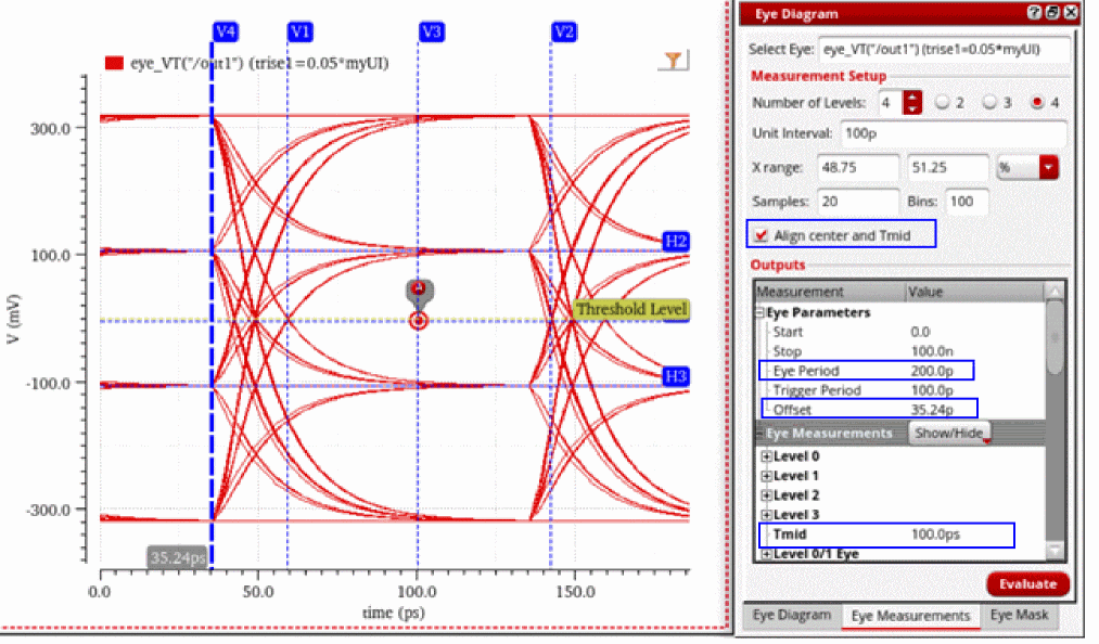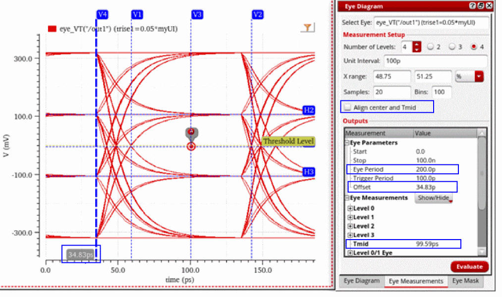 In the following eye diagram, observe that the offset of the eye is at 34.83ps, Tmid is at 99.59ps, and the center of the eye (eye period/2) is at 100ps (200/2), which indicates that Tmid and the center of the eye are not aligned together.
