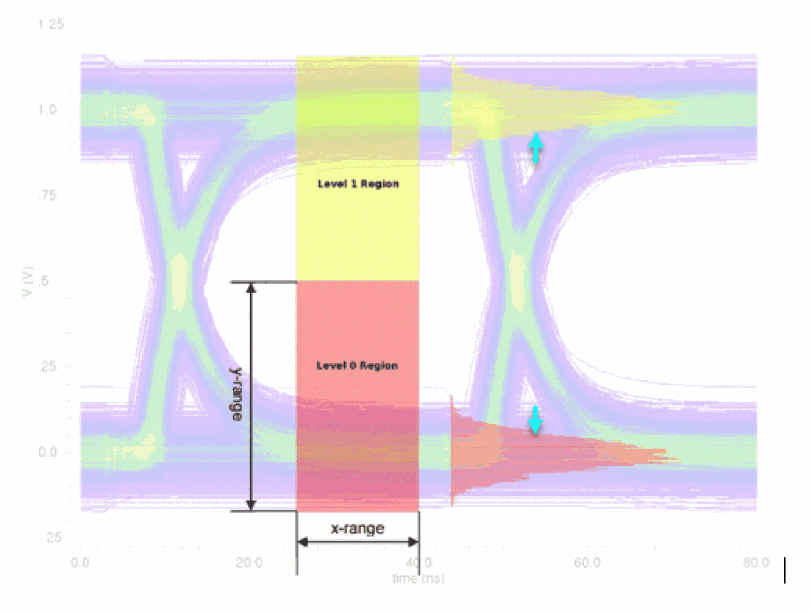 These values are shown on a real eye diagram with many signals transitioning. The risetime, falltime, and jitter of each signal impacts the plot, which can be obtained from interference, PVT, and some jitter is just random. Notice that the transition areas are highlighted in the figure below. The level 0 (in red) and level 1 (in yellow) annotation shows the voltage high and lows areas. The histograms that represent the signals in level 1 and level 0 areas have been superimposed.