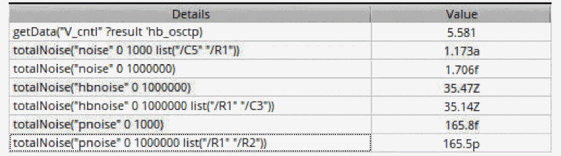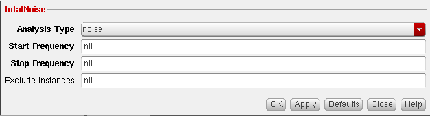 The following example shows the total noise calculated for the noise, hbnoise, and pnoise analyses with various start and end frequency values. The Exclude Instances argument is specified for some expressions that means noise from the given instances is excluded.