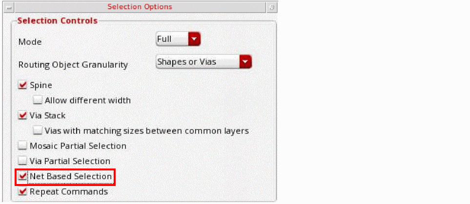 When you select the Reverse option on the Net Based Selection toolbar, shapes, vias, and instances with a net other than the net specified in the text field can be selected in the canvas. You can also use the environment variable