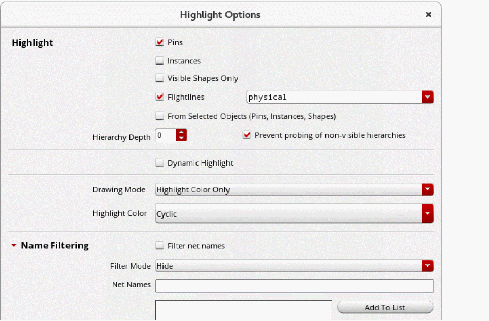 - In the Name Filtering section, selectively display or hide the probes only for the specified list of nets.