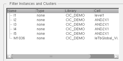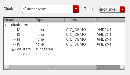 The selected instances and clusters are added to the trunk. Or, if you select the branch in the current cluster editing area, the instances and clusters are added to the correct branch. The following figure shows the current cluster editing area listing the clusters defined in the cellview in the tree table format. Use the scroll bar to display the view names.