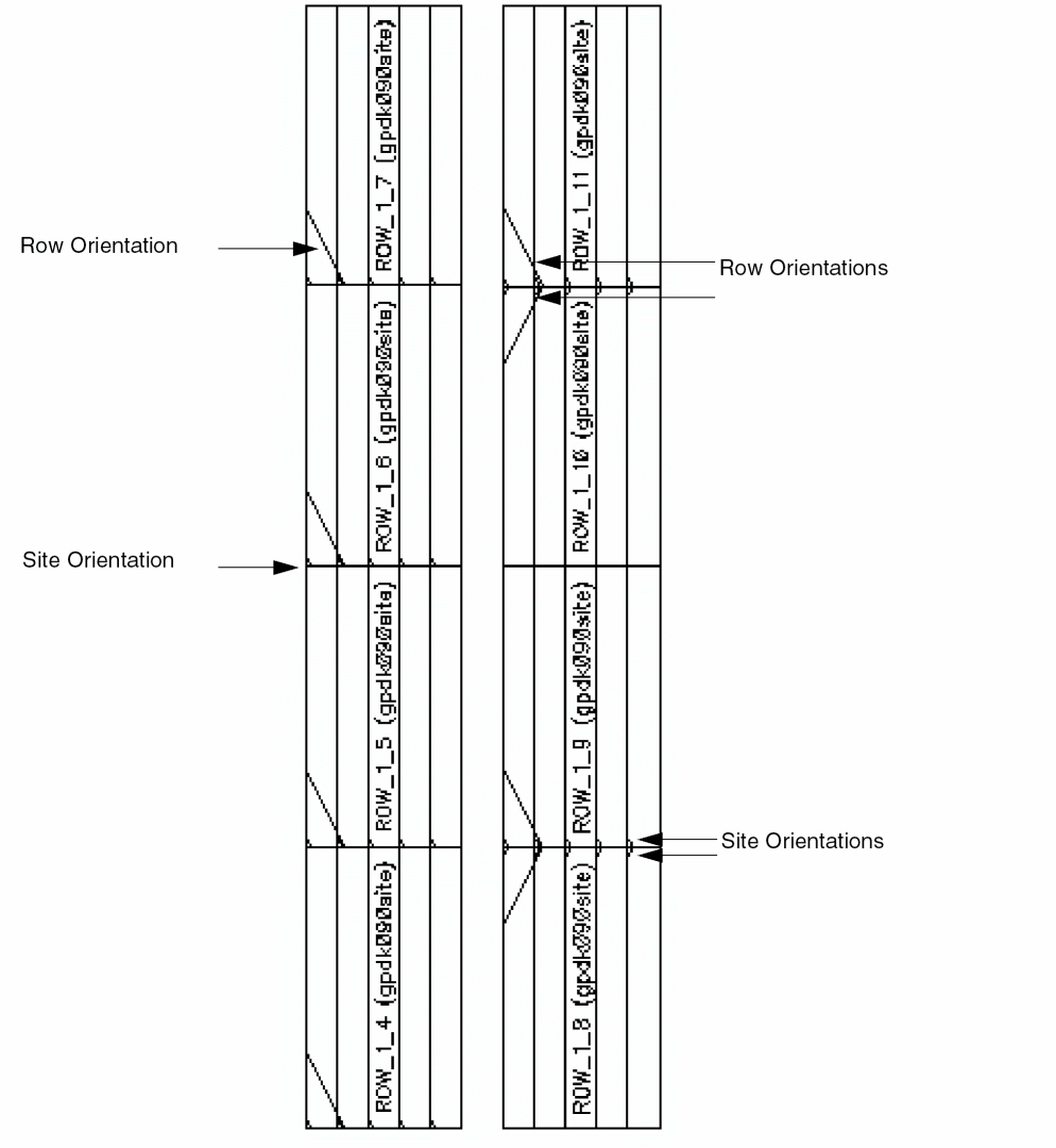 All subsequent rows follow the orientation that you set in this field. The valid values are R0, R90, R180, R270, MX, MY, MXR90, and MYR90. - Specify the flip and abut settings for rows in Options. For example, you may set every other row to flip or set only the first row to flip. You may specify the number of rows to abut or set to abut the first and second rows. You can also specify the space between the rows to be created.