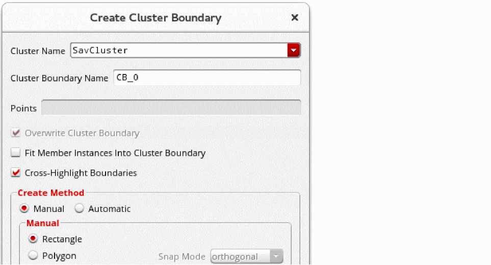Optionally, overwrite the automatically assigned name by typing a name for the boundary in the Cluster Boundary Name field. The name must be unique to the cellview.