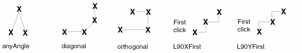 The following figure illustrates snap mode settings. If you chose an L90 mode, you can switch to the other L90 mode by clicking the middle mouse button. Keep clicking the middle mouse button to toggle between L90XFirst and L90YFirst.