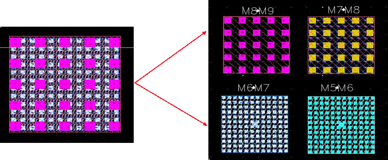 In the following example, the figure on the left is an M5M9 via stack created using the Stack option in the Create Via form. The figure on the right shows the constituent vias M5M6, M6M7, M7M8, M8M9 of the via stack.