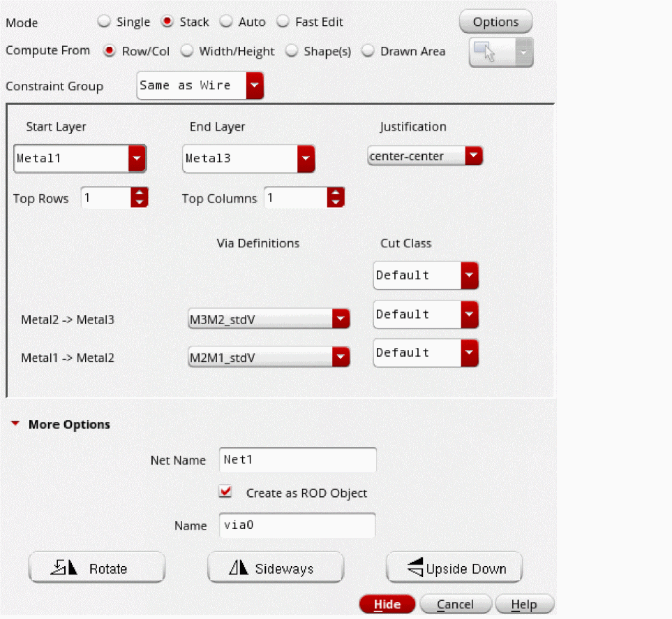 To rotate or mirror the via stack as you place it, click Rotate, Sideways, or Upside Down and then place the via stack. After placing the via stack, each time you click any one of these buttons, the via stack is further rotated or mirrored.