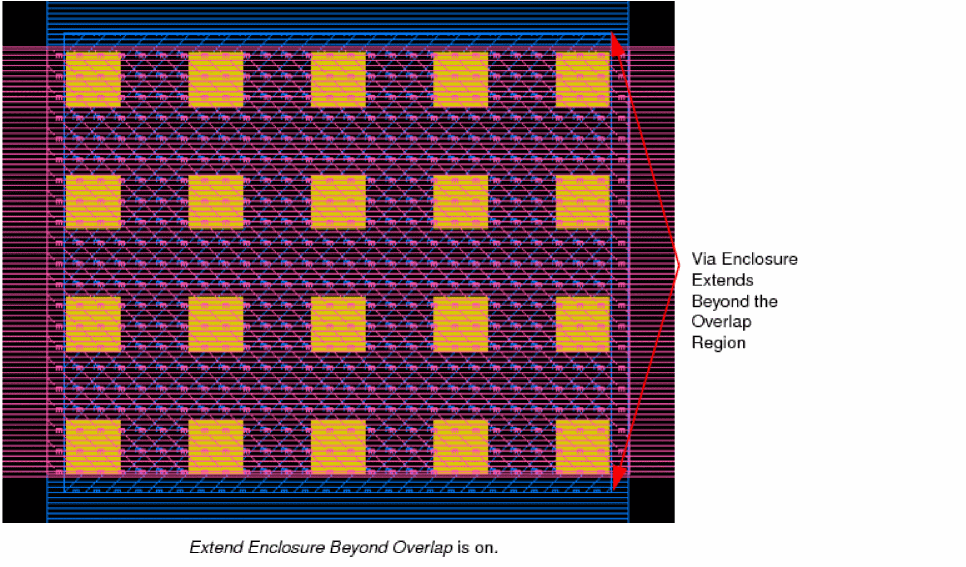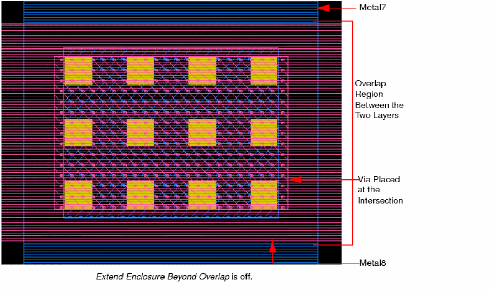 The following images show an example of a Single mode via created at the intersection of two shapes when the Compute – From Shape(s) check box is selected. The vias in the first image are generated when the Extend Enclosure Beyond Overlap check box is not selected in the Create Via Options form. The second image illustrates the enclosure extension when the Extend Enclosure Beyond Overlap check box is selected.