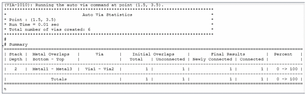 A statistics report is generated for auto via in the form of a table in the CIW. This report is best viewed when the default CIW font is mono.
