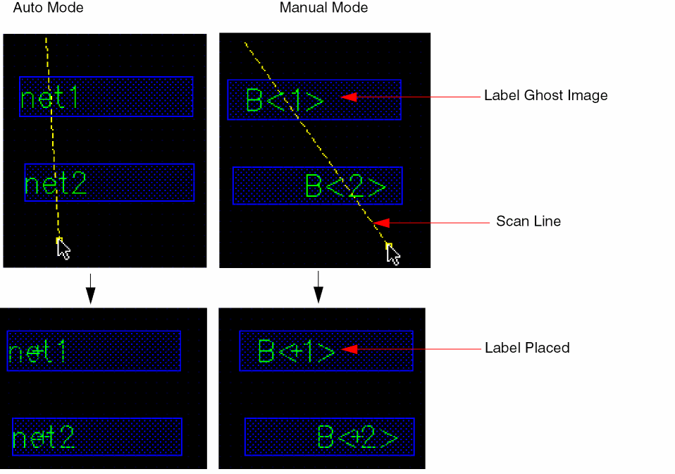 In the scan line method, since you use the middle mouse button to draw the scan line, you cannot use the mouse scroll wheel to zoom in or zoom out of the design while creating the scan line. The Tab key is also unavailable to pan through the design. Therefore, in a scenario where there is a large number of objects to be labeled, some of which are out of the current display area, ensure that the Auto Zoom Out check box in the Scan Line section of the Create Label form is selected. As you click and drag the scan line beyond one of the edges of the design display area (to allow the scan line to intersect objects currently not in view), the Auto Zoom Out option automatically zooms out the design to make visible the other objects that need to be labeled. As you continue to drag the scan line, the design keeps zooming out and panning automatically. When you release the middle mouse button to complete the scan line, the design returns to the original zoom level and labels are added to all objects that were intersected by the scan line. If you do not select this check box, no zoom out occurs, though the design pans as you drag the scan line beyond a design display area edge.